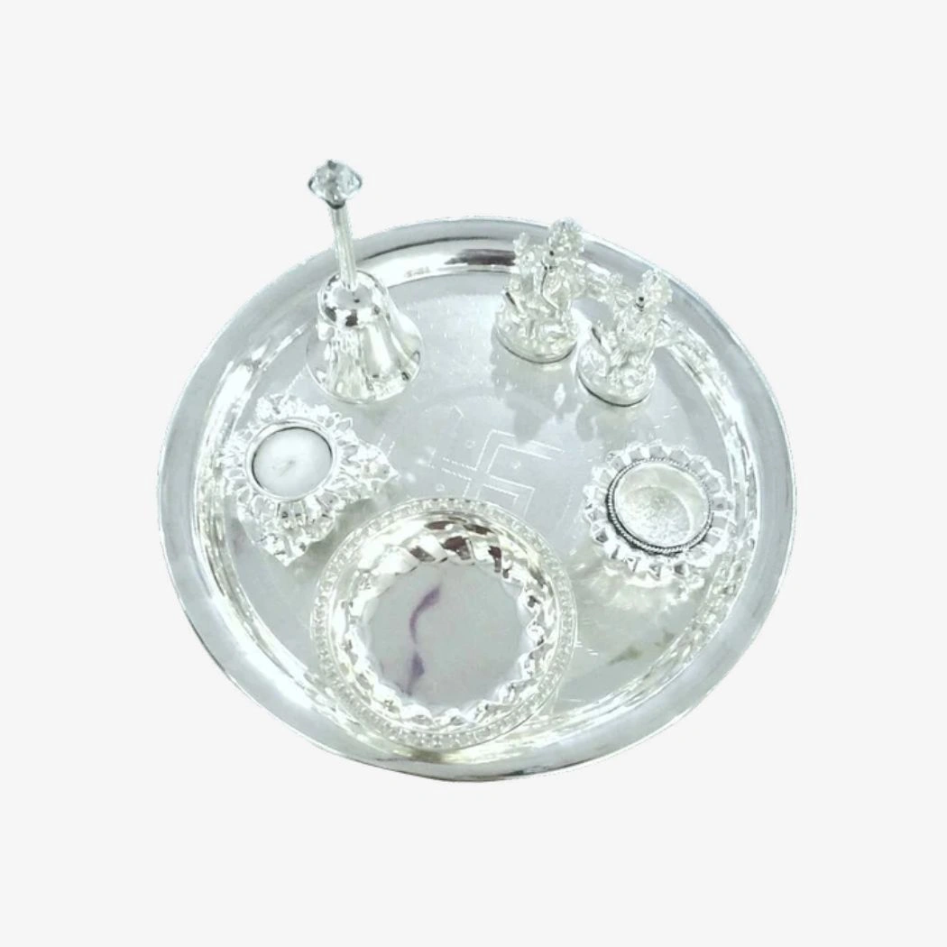 The German Silver Pooja Set is a beautifully crafted stand used for holding incense or camphor during pooja ceremonies. Made from durable German silver, it adds a touch of elegance and sophistication to spiritual rituals, creating a serene atmosphere.